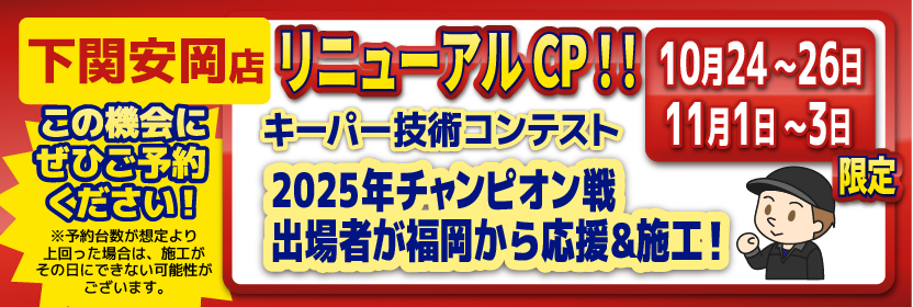 また、キーパーコーティングの技術資格を持ったスタッフが施工致します!下関安岡店には、EXキーパーコーティング技術1級資格者1名、キーパーコーティング技術1級資格者2名が在席しております。このように技術資格を持ったスタッフが在籍している為、安心してお客様の愛車をお預け頂けるかと存じます。キーパー技術コンテストの受賞歴や技術コンテストの上位大会への出場歴もあり、2025年には下関安岡店のスタッフが山口県で施工技術上位のみが出場できる「チャンピオン決定戦」に出場と、高いコーティング技術力を備えたスタッフも在籍しています。
