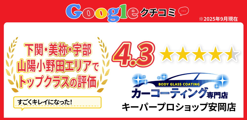 私達キーパープロショップは、山口県下関・美祢・宇部・山陽小野田エリアのカーコーティング専門店として、日本ダントツのカーコーティングブランド、キーパーの専門店として認定を受けております!プロ専用の設備、道具、材料とプロのカーコーティング技術で愛車をピカピカにします。 是非一度ご来店ください!